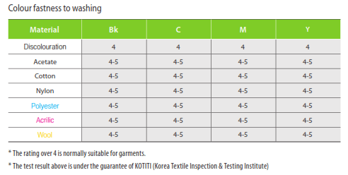 * La tinta EcoNova ID y la tinta OEM presentan los mismos resultados que se muestran en la tabla, por lo que ambas son adecuadas para utilizarse en todos los tejidos y soportar los lavados.
