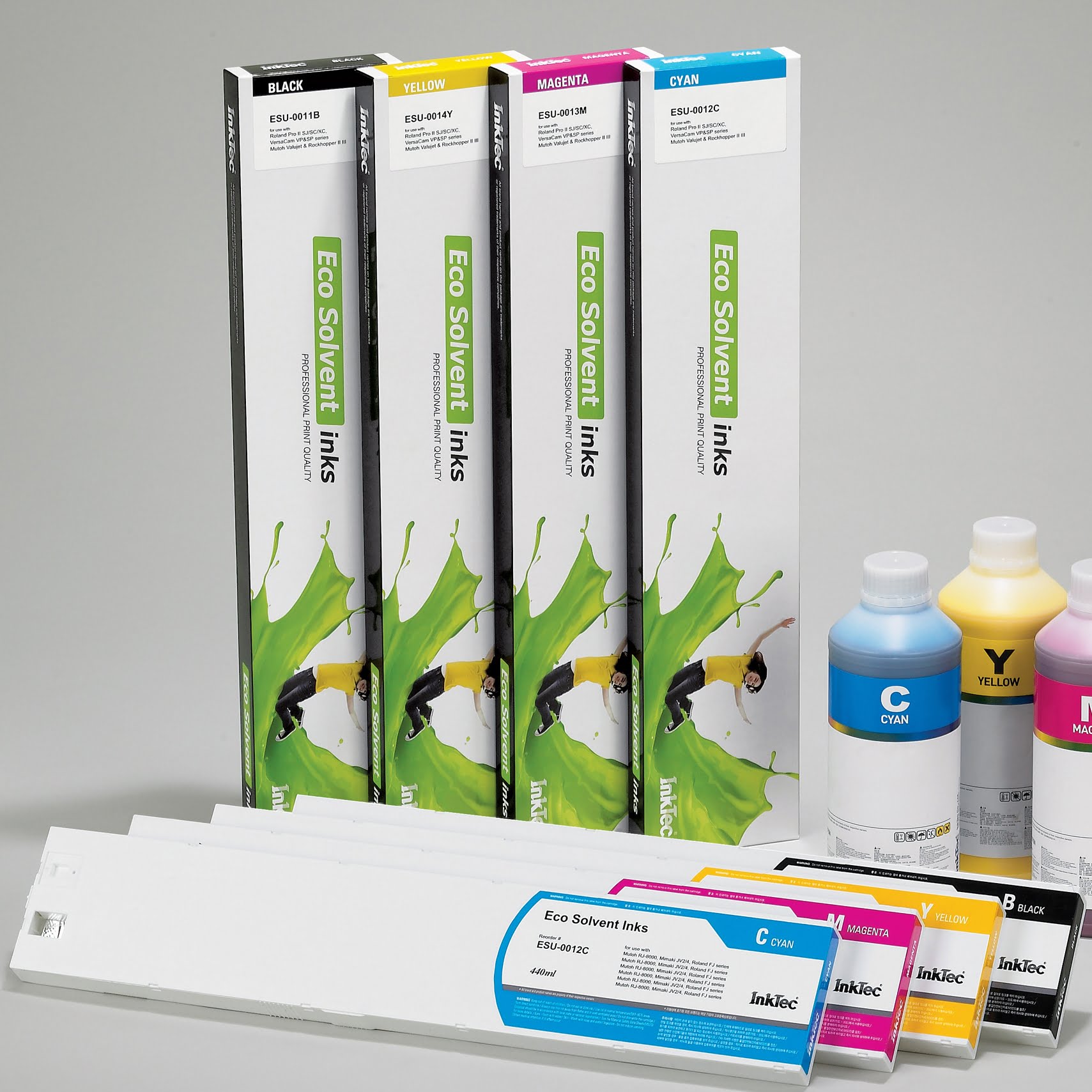 Cartuchos de 440ml de tinta eco-solvente para plóters Roland y Mutoh con cabezales de impresión Epson DX4 y DX5.